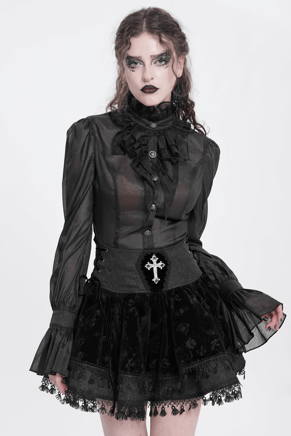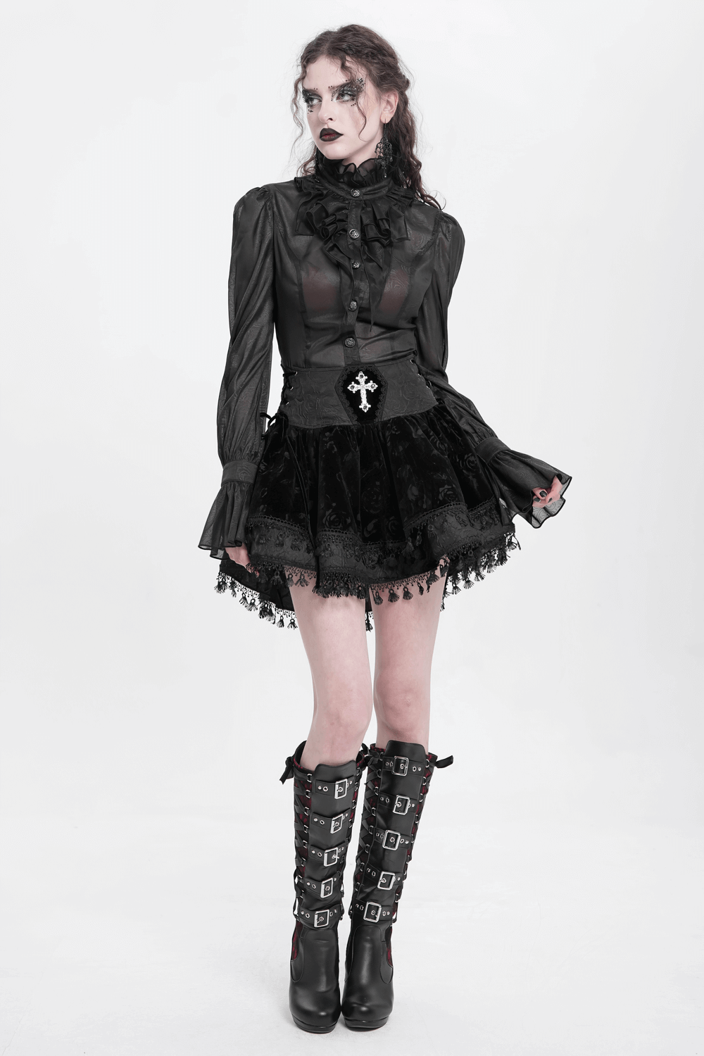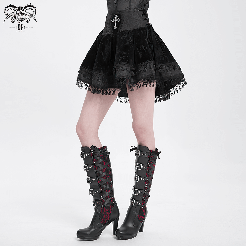 This high-waisted gothic velvet skirt showcases a vintage corset-style waistband with elegant lace-up accents for a customizable fit. An embroidered cross makes a striking focal point, while lace trim and a tassel hem elevate its Victorian flair. Made from a blend of polyester and polyamide, this flared design is ideal for gothic, steampunk, and alternative fashion lovers.