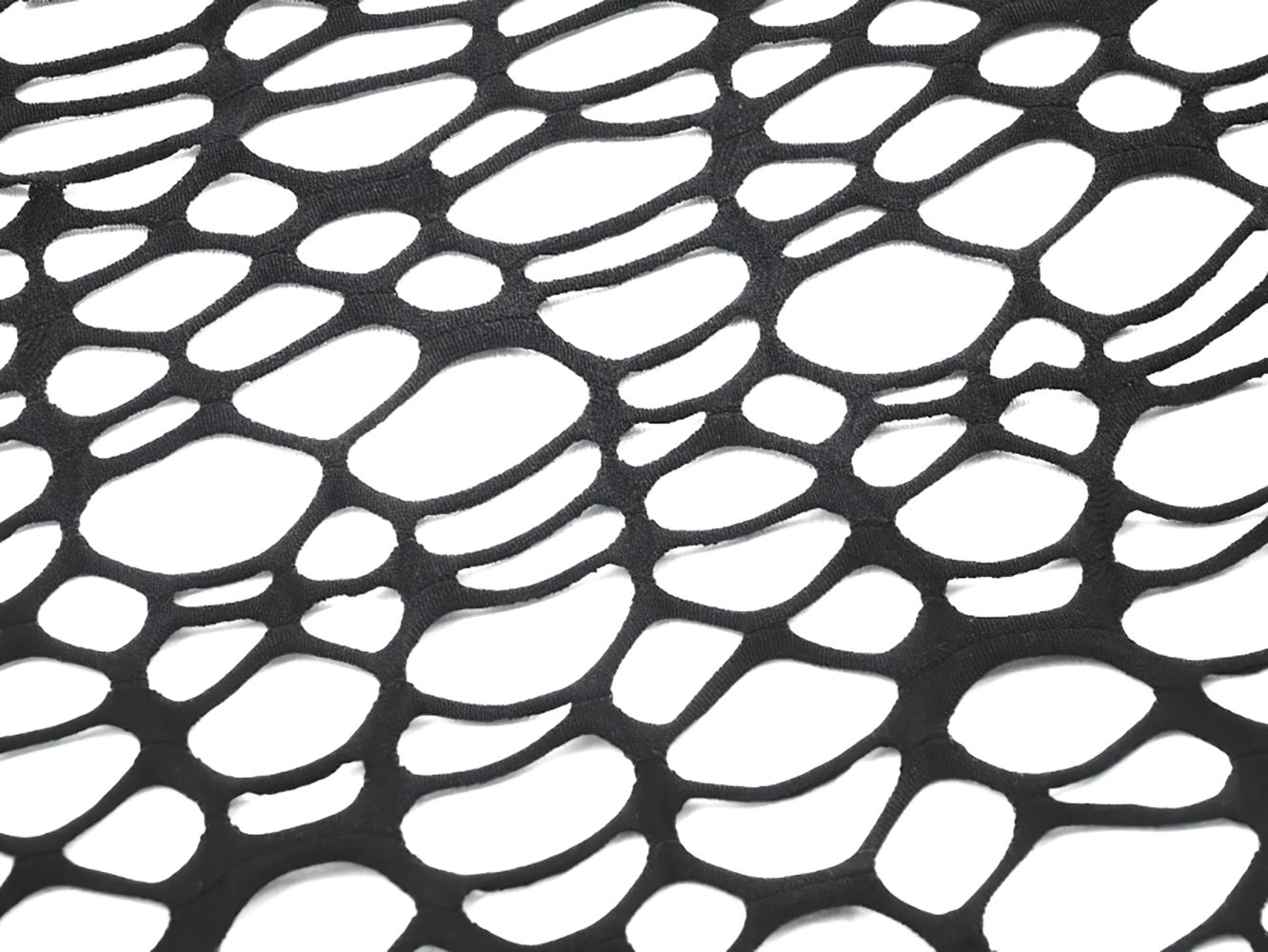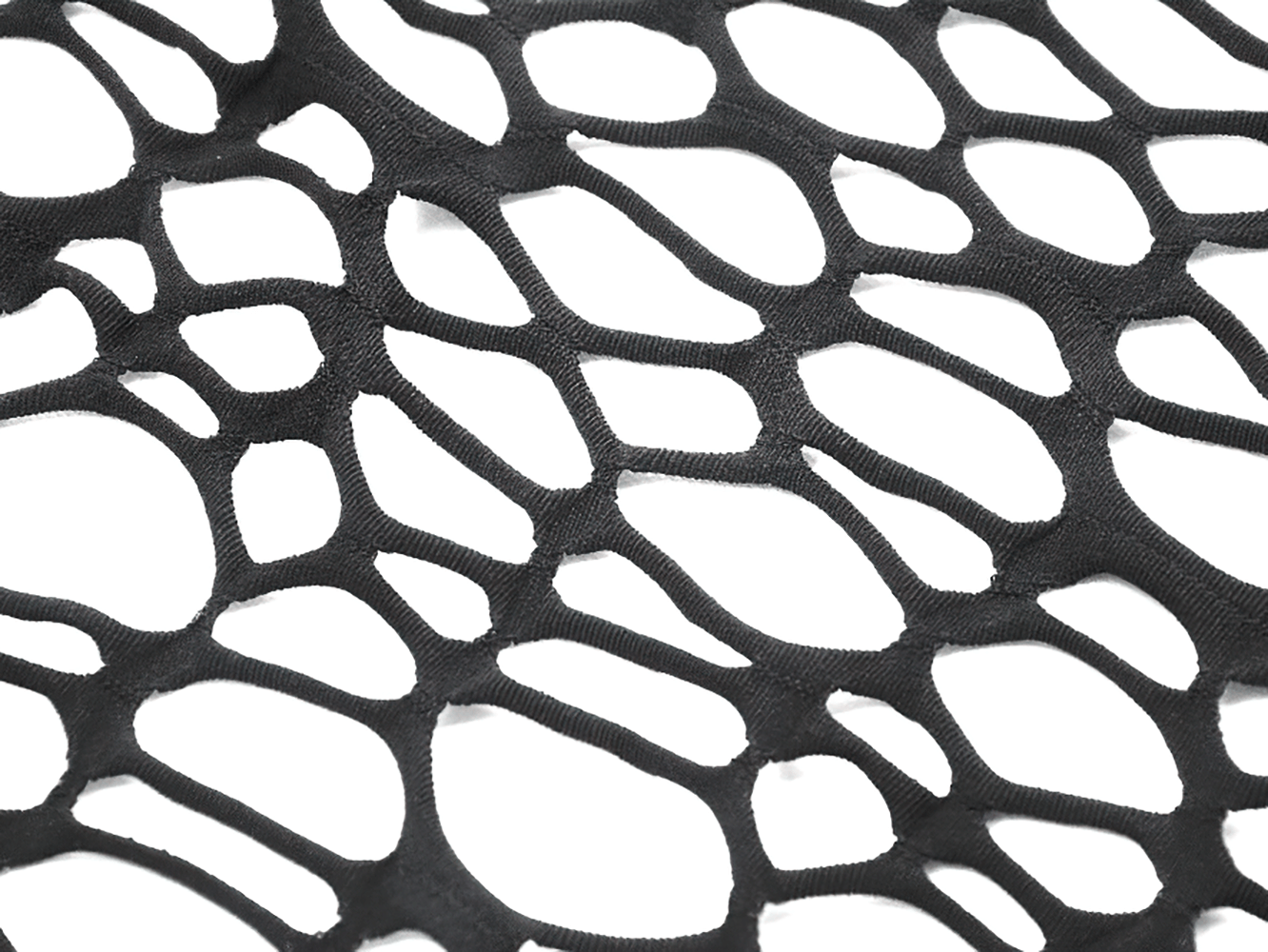 This black mesh crop top blends grunge and gothic energy through its open-knit texture and bold flared sleeves. The off-shoulder cut and uneven web-like pattern deliver a striking, edgy shape that works seamlessly with corsets, leather trousers, or layered pieces. Ideal for fans of dark style, this distressed net design brings attitude to any alternative wardrobe look.