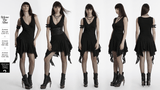 This gothic sleeveless dress combines elastic knit fabric and perforated mesh for a unique texture. The deep V-neck adds a daring flair, while the asymmetrical hem offers an edgy, rebellious vibe. Fabric splicing elevates its avant-garde style, perfect for gothic, punk, or alternative fashion enthusiasts. Great for casual outings, parties, and cosplay events.