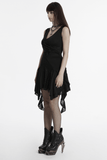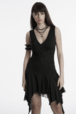 Gothic sleeveless dress with deep V-neck, asymmetrical hem, and textured fabric splicing for a punk-inspired look.