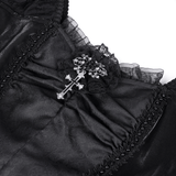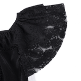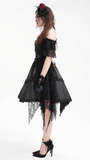 Channel your gothic essence in this lace dress adorned with detailed skull patterns and tiered layers. Halter straps and off-shoulder sleeves lend edgy sophistication, while the lace-up corset back offers a tailored fit. The asymmetrical hemline with skull accents ensures you stand out at gothic gatherings, Halloween, or for alternative style fans. Step boldly into your unique vibe.